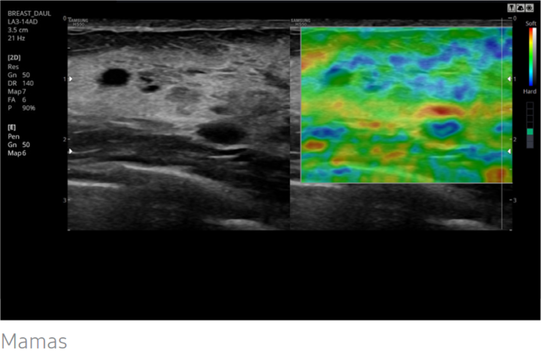 ElastoScan™, una técnica de ultrasonido de diagnóstico para la elasticidad de imagen, detecta la presencia de masas sólidas en tejidos y convierte cualquier rigidez en imágenes a color.