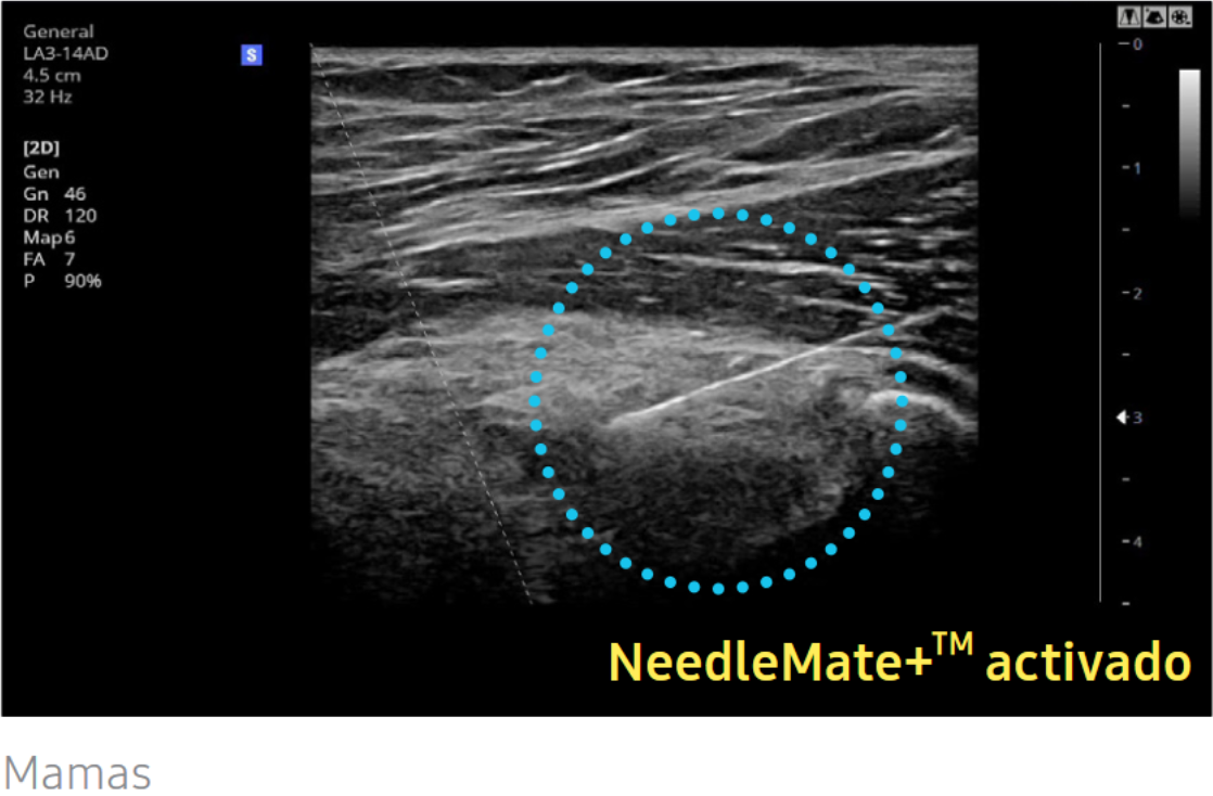 NeedleMate+™ garantiza la orientación precisa de la aguja cuando se realizan procedimientos de intervención comunes. Exploración oblicua. Exploración oblicua permite dirigir la imagen de ultrasonido lineal y mejora la visibilidad de la aguja cuando el ángulo de insonación y la aguja están en un ángulo perpendicular entre sí.